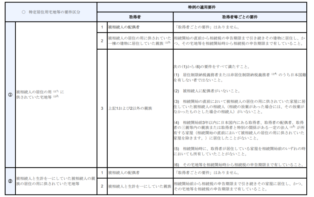 相続開始の直前において被相続人等の居住の用に供されていた宅地等で、次の表の区分に応じ、それぞれに掲げる要件に該当する被相続人の親族が相続または遺贈により取得したものをいいます(次の表の区分に応じ、それぞれに掲げる要件に該当する部分で、それぞれの要件に該当する被相続人の親族が相続または遺贈により取得した持分の割合に応ずる部分に限られます)。なお、その宅地等が2以上ある場合には、主としてその居住の用に供していた一の宅地等に限ります。